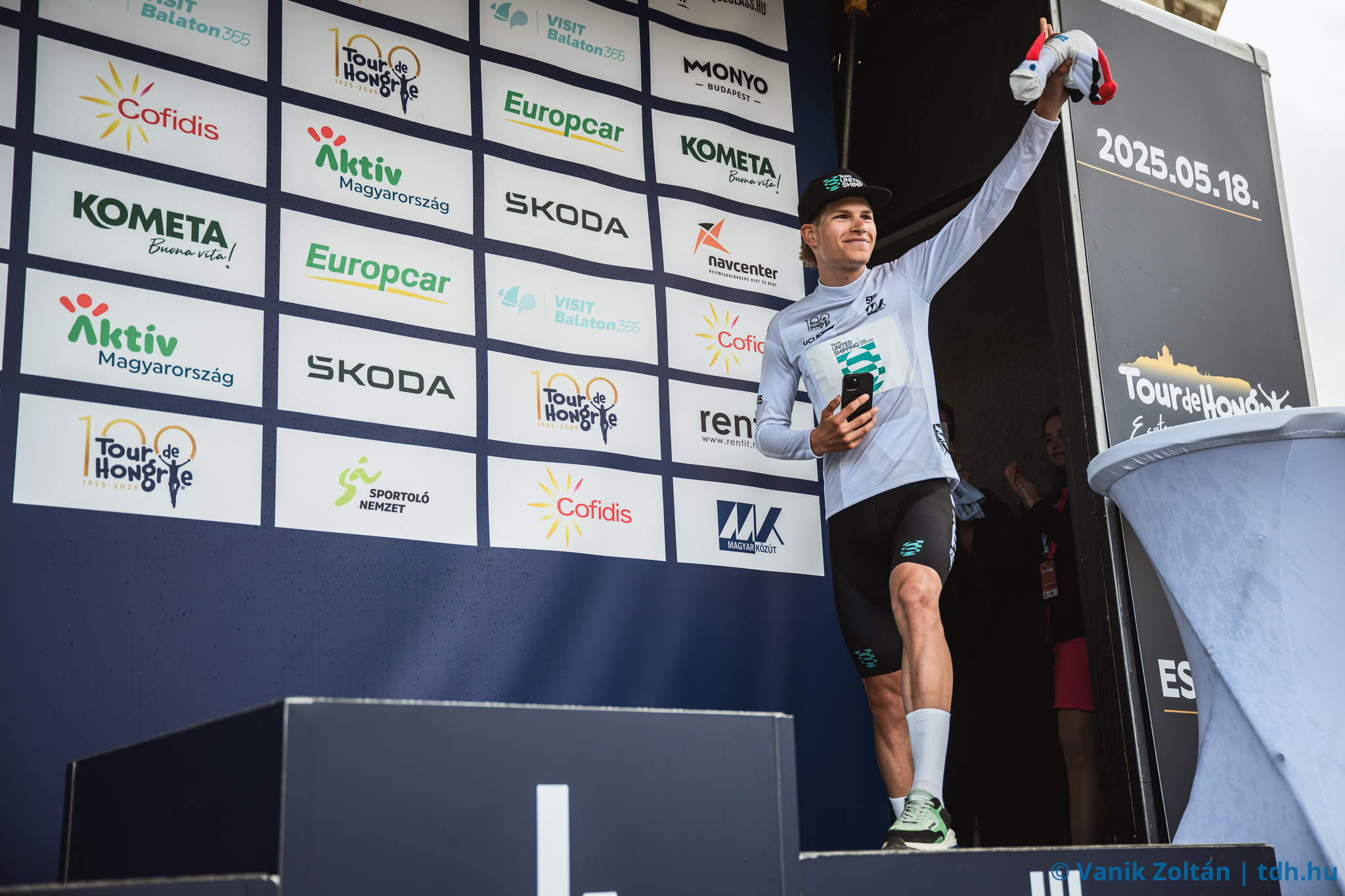 Siebe Deweirdt piros trikóban a 2024-es Tour de Hongrie dobogóján