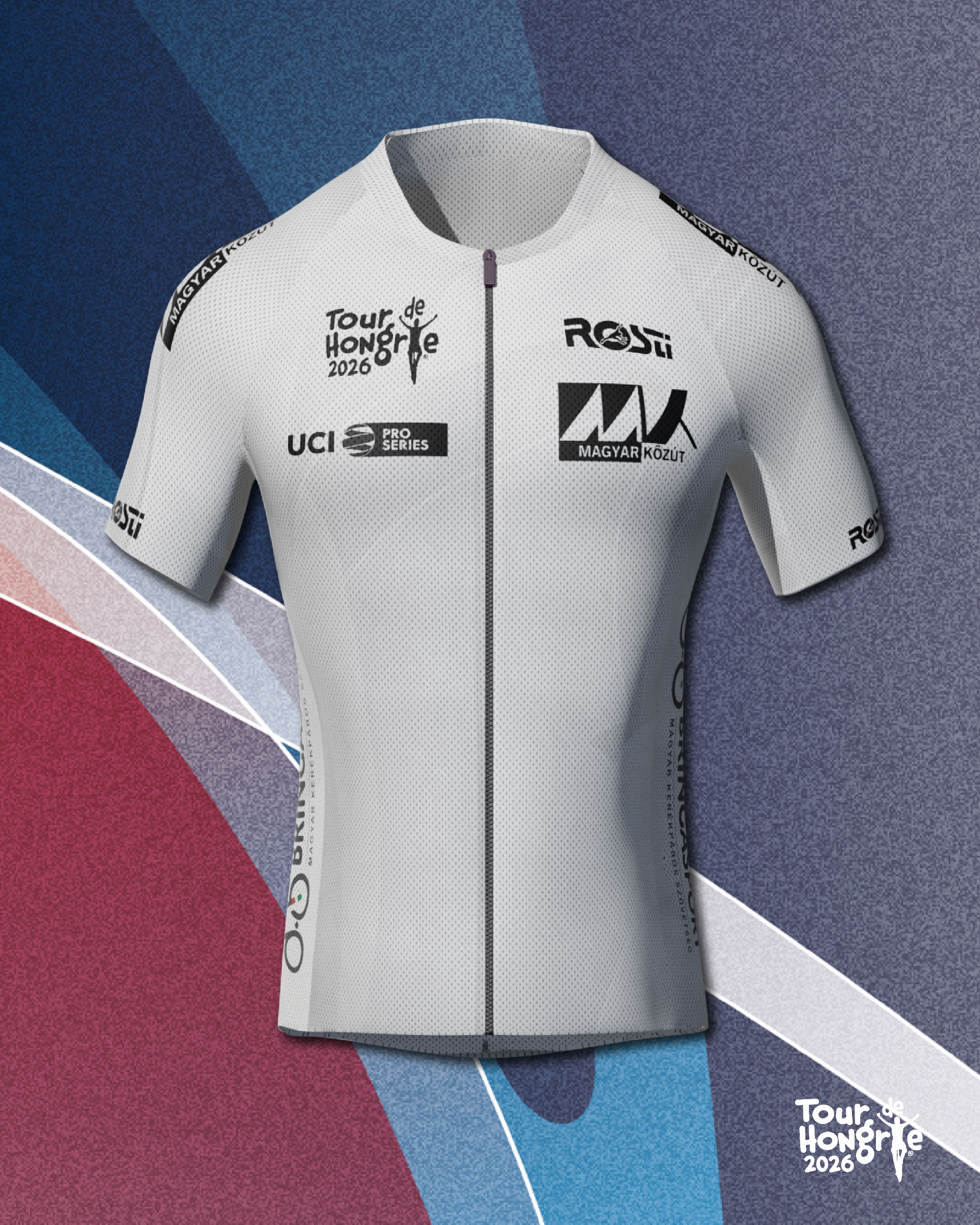 2026-ban a gyártó Rosti emblémája és a verseny otthonául szolgáló városok nevezetességei mellett a Magyar Közút logója színesíti a mezt.