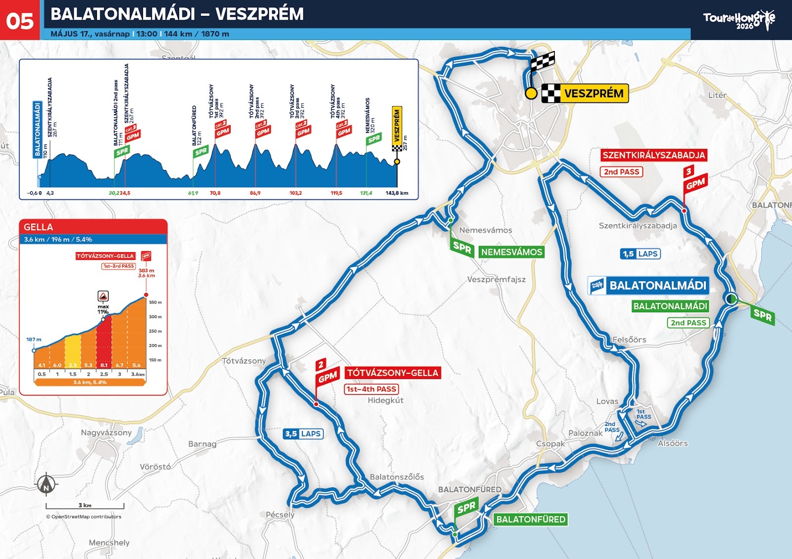 The 47th Tour de Hongrie will conclude on May 17 with an unpredictable stage reminiscent of Belgian one-day races. The venue will be the "European Capital of Sport" – a title awarded to Veszprém and the Balaton region for 2026. The competitors will have to tackle the steep climb of Szentkirályszabadja (2.1 km; 5.6%) twice and Gella (3.6 km; 5.4%) four times between Balatonalmádi and Veszprém. Despite the short distance of only 144 kilometers, the stage has an elevation gain of almost 2000 meters, and with three Intermediate Sprints, it offers ideal terrain for early attacks.