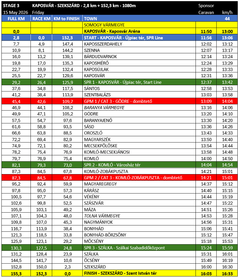Another flat stage awaits the sprinters on May 15. Stage 3 of Tour de Hongrie starts in Kaposvár, then continues eastward after a short loop around Zselic. Before the finish in Szekszárd, the riders will face 152 km, three Intermediate Sprints and two categorised climbs, as well as an elevation gain of more than 1000 meters.