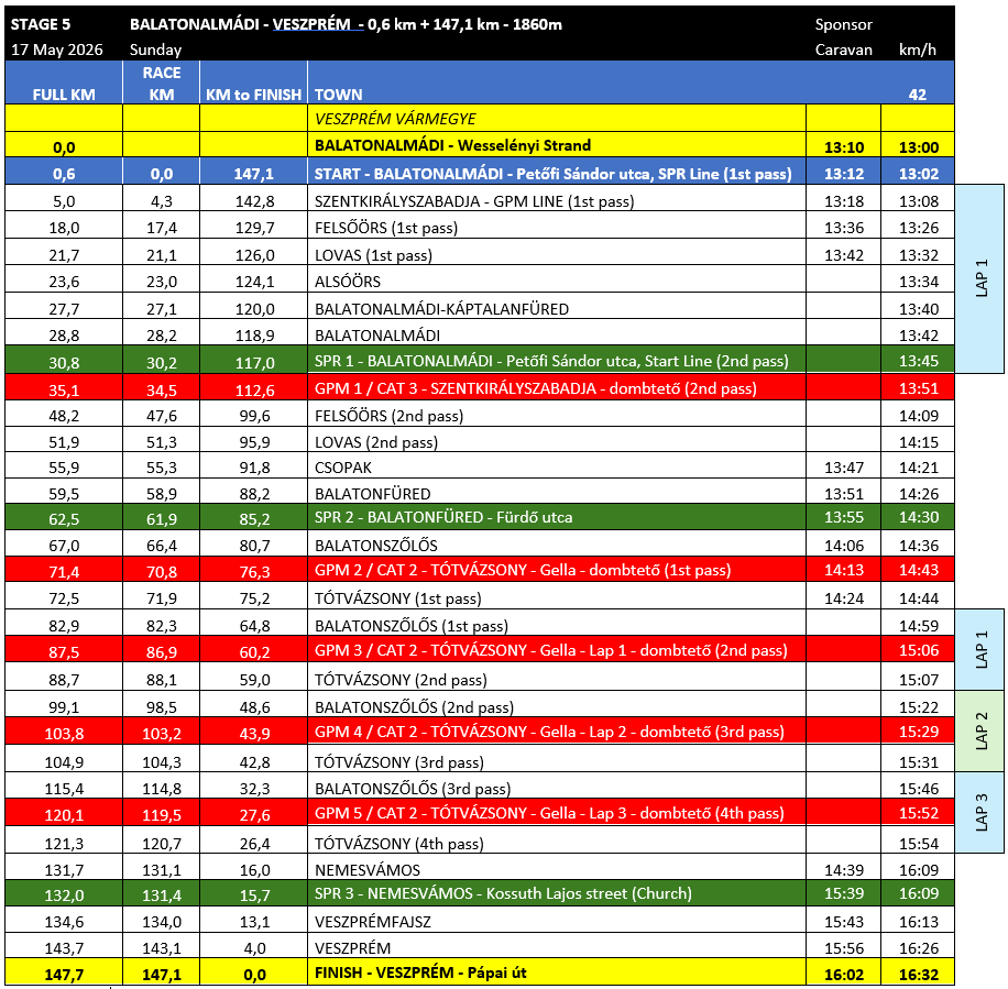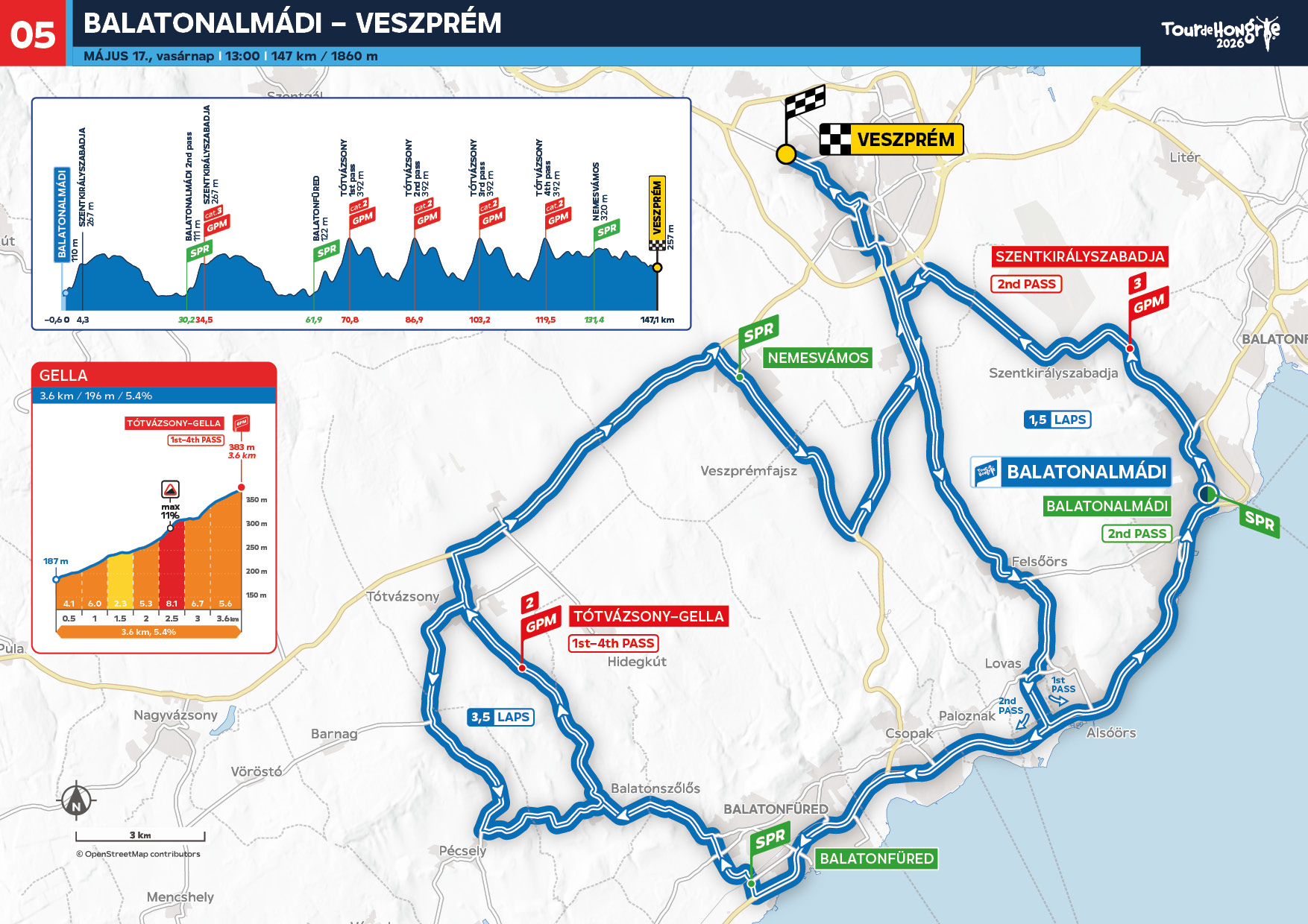 The 47th Tour de Hongrie will conclude on May 17 with an unpredictable stage reminiscent of Belgian one-day races. The venue will be the "European Capital of Sport" – a title awarded to Veszprém and the Balaton region for 2026. The competitors will have to tackle the steep climb of Szentkirályszabadja (2.1 km; 5.6%) twice and Gella (3.6 km; 5.4%) four times between Balatonalmádi and Veszprém. Despite the short distance of only 147 kilometers, the stage has an elevation gain of almost 2000 meters, and with three Intermediate Sprints, it offers ideal terrain for early attacks.