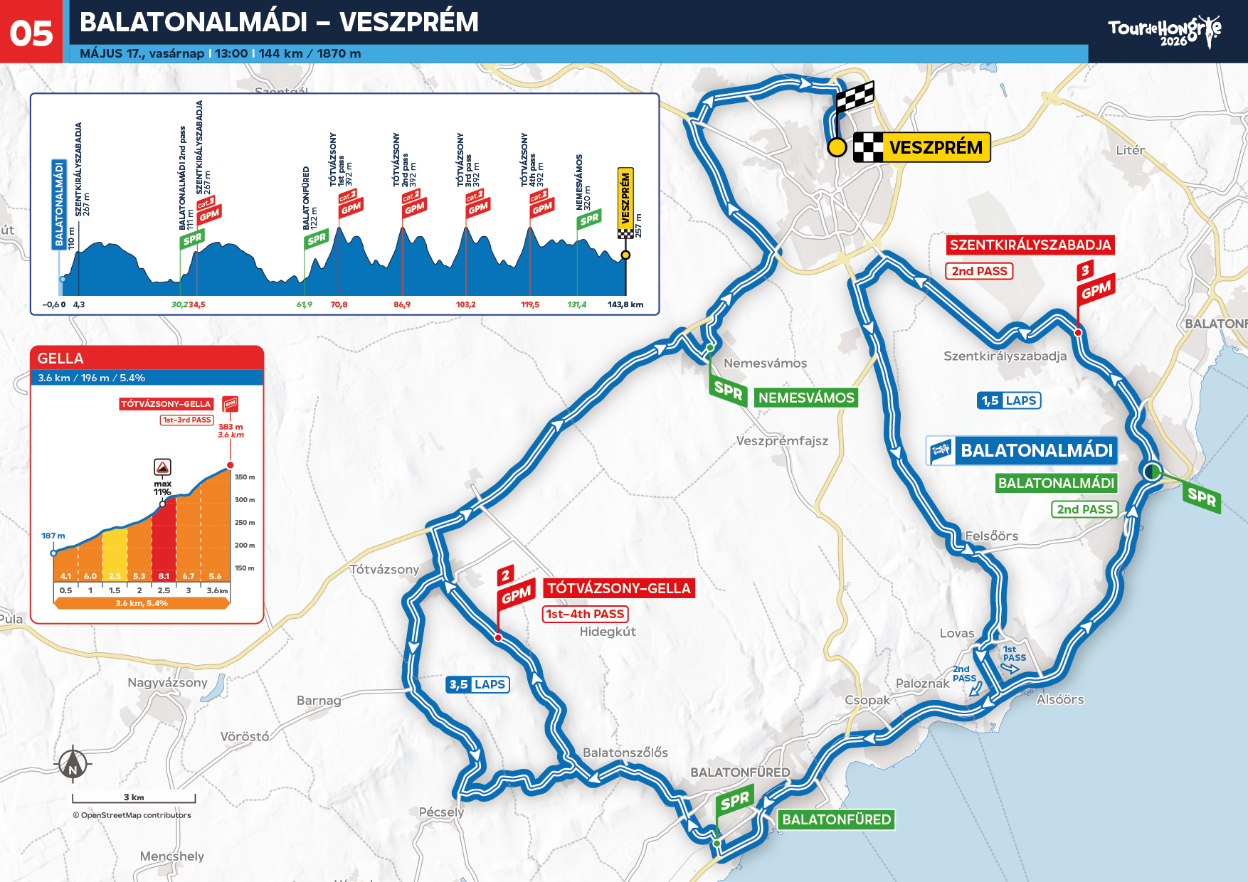Egy kiszámíthatatlan, karakterében leginkább belga egynaposokra emlékeztető etappal zárul a 47. Magyar Kerékpáros Körverseny május 17-én. A helyszín „Európa sportfővárosa” lesz – a kitüntetett címet ugyanis Veszprém és a Balaton régiója nyerte el 2026-ban. A versenyzőknek kétszer Szentkirályszabadja (2,1 km; 5,6%), majd négyszer a Gella (3,6 km; 5,4%) meredekét kell leküzdeniük Balatonalmádi és Veszprém között. A mindössze 144 kilométeres szakasz rövid távja ellenére is csaknem 2000 méternyi szintemelkedést tartogat, a három gyorsasági részhajrával együtt pedig ideális terepet kínál a korai támadásokhoz.